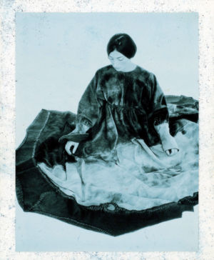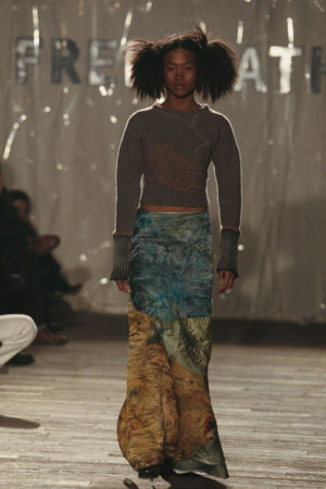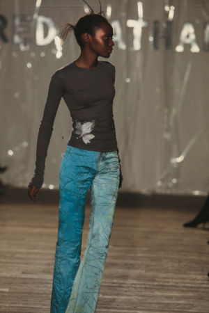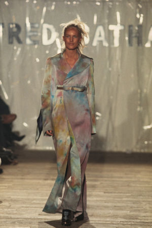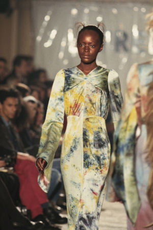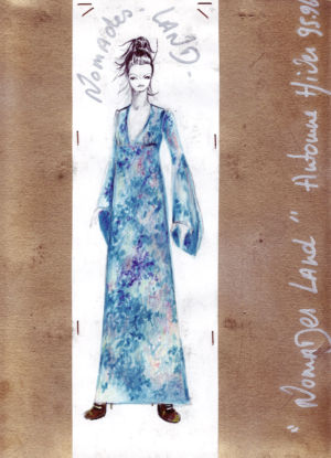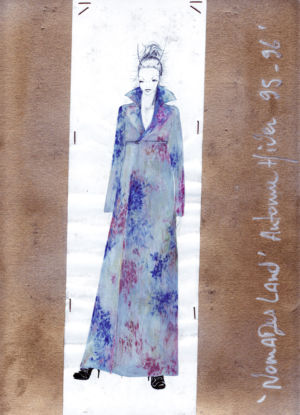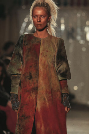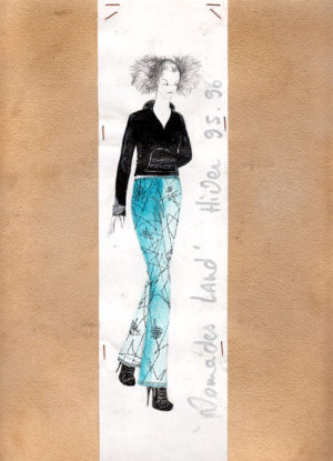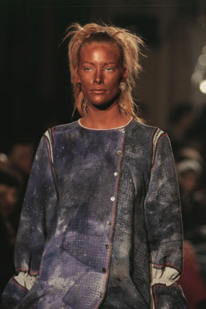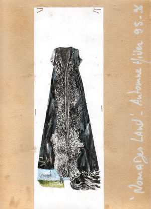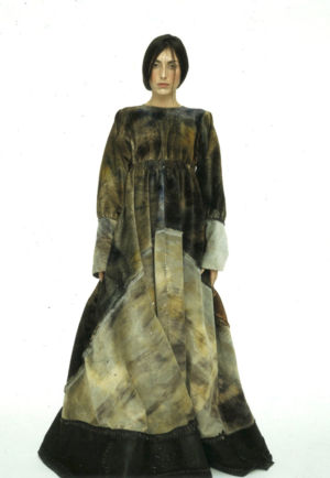 Re-cut salvaged virgin wool jumpers to which ribbed wool cuffs have been added. Diamond-shaped patches on the elbows. ‘Blade sleeve’ dresses. Narrow backs and V-necks. No shoulder seams. Very tight cuffs. A line emphasises the elbow and knee joints. Different-coloured pigments on satin and silk crepe: blue, turquoise, orange, pale yellow, aqua green, darkened by tonalities of black, night-blue, bronze and charcoal grey.