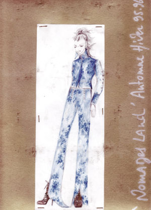 It is also a dream, a crossing of times and eras. Women with faces coloured by earth and sun. Tanned skins, pierced with metal items, very dry, very matt, unkempt and extremely long hair, most of the time tied up into ponytails falling below the waist. High-heeled (12cm), metallic Louis XV ankle boots quilted with dyed silk.