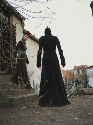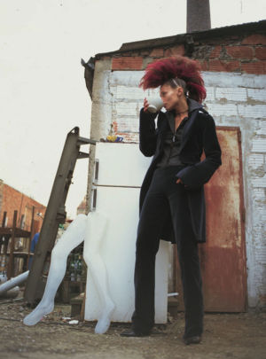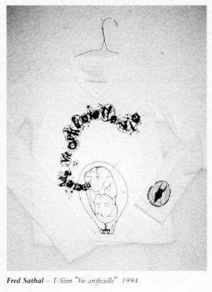 Long-sleeved ‘bouclé cotton’ jersey t-shirts, with silkscreen prints of a child in his mother’s womb, the umbilical cord of which is made of the letters of the title: ‘Artificial Life’.