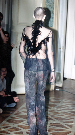 Platform clogs match the silhouettes, emphasising the animality and the strangeness of the characters through outgrowths of cock feathers in tuft.