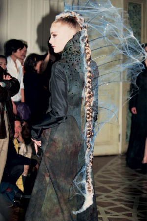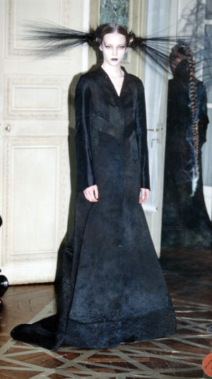 A collection designed with a gothic feeling Eighteen girls, diaphanous skins, the eyes outlined with black, nails/claws, sculptures/hair.