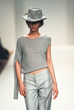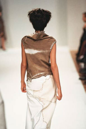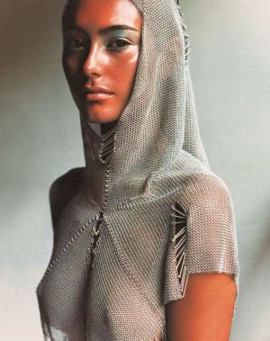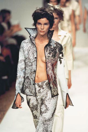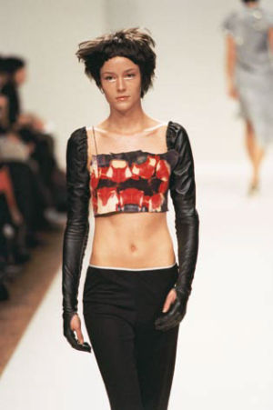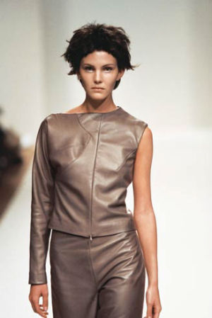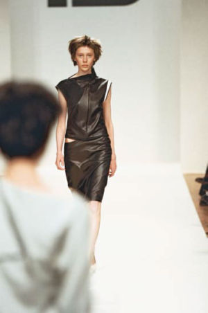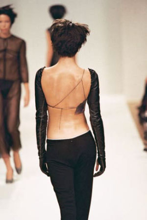 Tops et robes en cuir, gants aux épaules, bandeaux poitrine, manchettes et borsalino revisités, escarpins “pattes d’oiseaux”, chaussures aux semelles talons aiguilles où le pied est nu ainsi que maintenu par des rubans de cuir qui s’enroulent et se nouent entre cambrure et coup de pied.