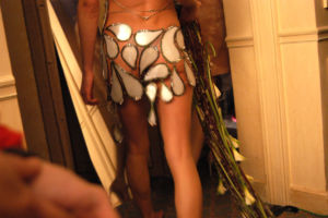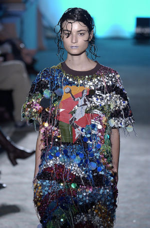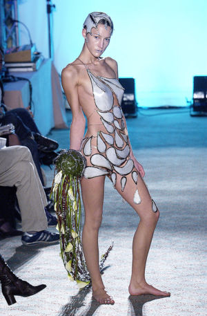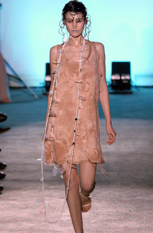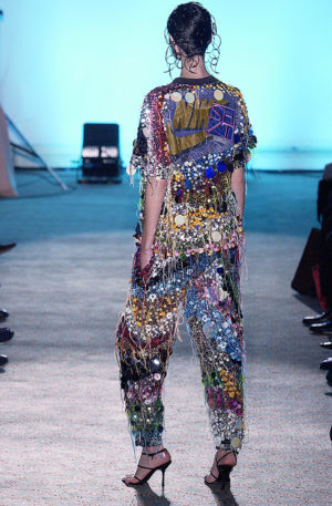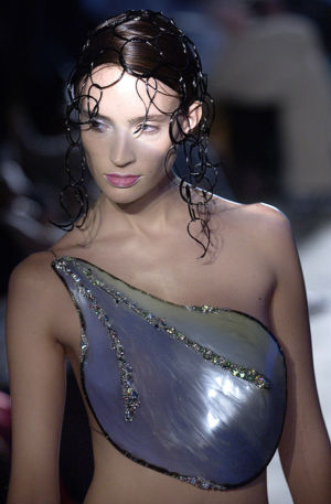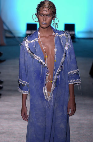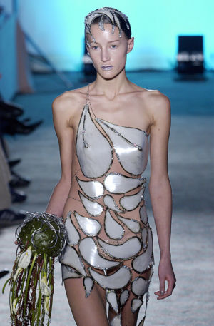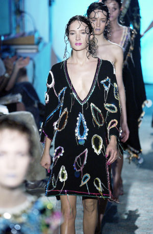 Work on fluidity, a tribute to summer, to the Water element, to light, colours and life. Drop-shaped patterns and cut-outs: from this simple shape, I create patterns and designs in applications embroidered with sequins and ‘crystal’ spangles for seven black dresses made of double-layered silk jersey; also swim jewels like Calder-like mobiles for naked skin, made of thermoformed plastic, and cut up, pearly, assembled with a net of thin silver chains.