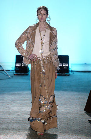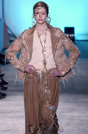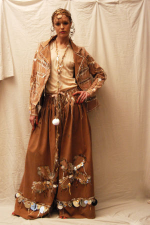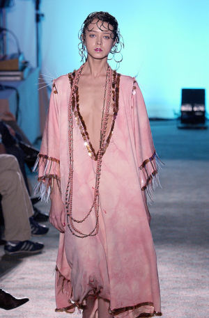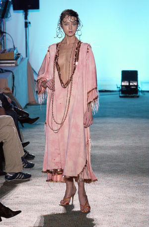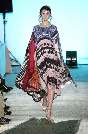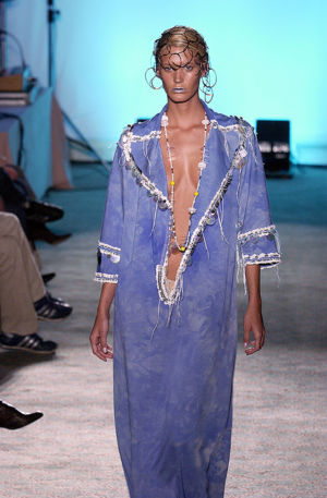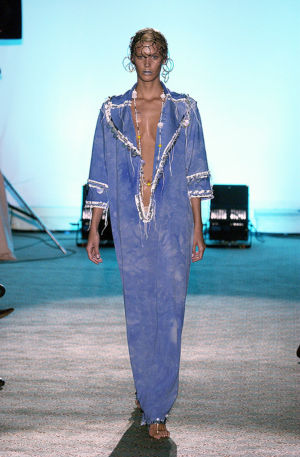A new version of the cruise spirit with large dresses made of Indian pink and blue Madonna heavy silk jersey, a XXL t-shirt and rainbow-coloured jogging bottoms, dresses and a cloak made of scarves −