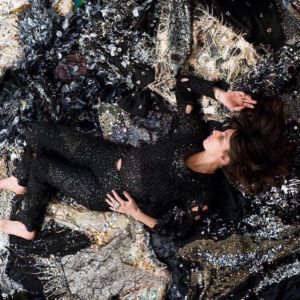 The wardrobe is constituted of favourite materials, such as cashmere, jerseys, lace, silks, fur, cotton threads, spangles and sequins for decorations that look like a nebula, a cosmic storm, a solar gale, a black hole. This quest for origins carries me and makes me use linen and hemp, a fundamental material, from which I draw new visions and shapes.